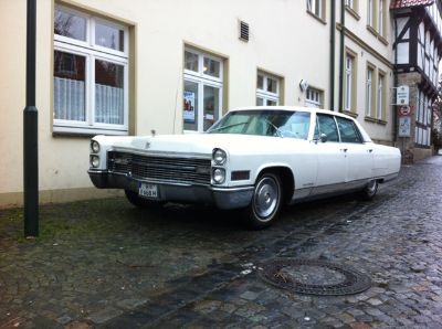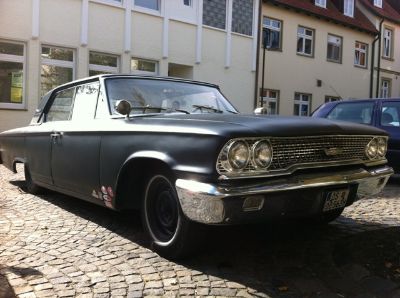 Dieser Lincoln Continental dürfte Jahrgang 1963 sein. Und damit etwa 5,50 m Länge, ca. 2,5 Tonnen Leergewicht und mindestens 7,0L Hubraum auf die Straßen bringen. Berühmt durch das Kennedy-Attentat wurde das Cabrio, aber die Limousinen mit den "backside-suicide-doors" verkauften sich auch gut. 22.05.2011, Eisdiele