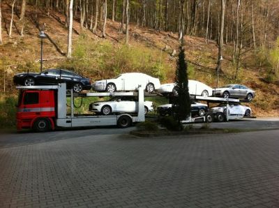Audi-Transporter mit heißer Ware: 1. Etage, mit Verhüterli, ein A6 lang, dahinter ein A7, und auf dem Hänger ganz hinten unten ein R8.